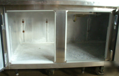 A cooled prep table with three condiment flip tops. Raised platform for these lids helps prevent cross-contamination of products while operating quickly, adding your various toppings. Three doors of storage allows you plenty of room for dough and backup items, saving time in busy periods.