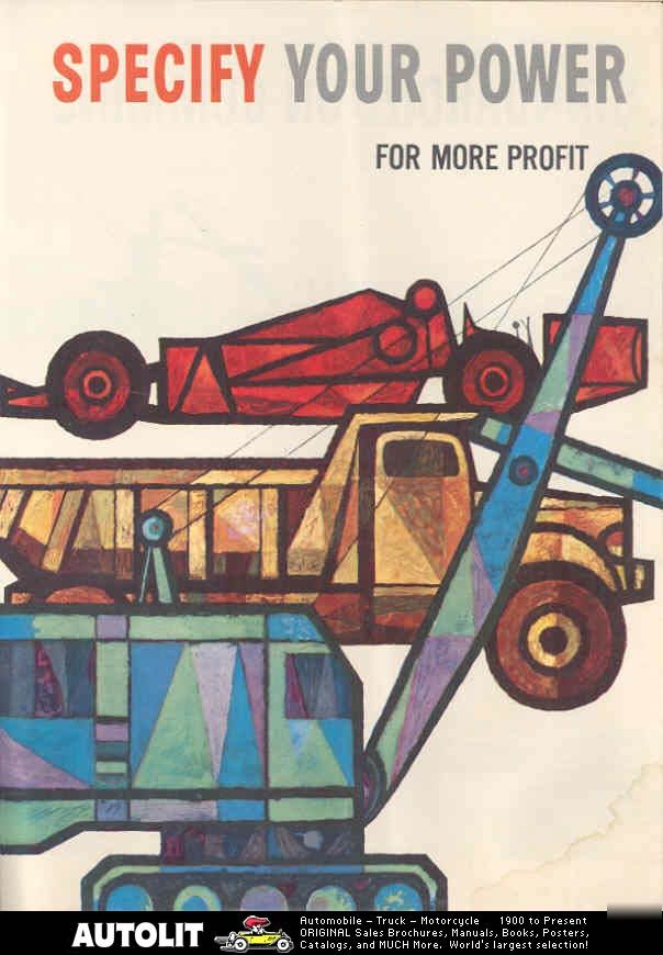 Original Color folder , 8 x 11 folded , 16 x 11 unfolded , has a vertical fold , torn at binding , shows Cummins 335hp Turbodiesel , also shows several different construction vehicles which used Cummins including Oshkosh , Dart , International , Mack , Walter , and White Construction Dump Truck , Bucyrus Erie Shovel , Thew Lorain Crane , Wooldridge Scraper , Peterbilt Truck , Cook mixer , Marion Crane , and Lima Crane .