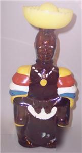 This lovely bottle is rare and hard to find! Made of a brown glass. Island man is playing a drum. Has his tribal necklace and earrings on. Large, yellow plastic hat covers the bottle's lid. I'm guessing this was a bottle for rum. Has some paint loss. Some sticker remnants on the front of the drum. In great condition! Perfect decoration for your bar!